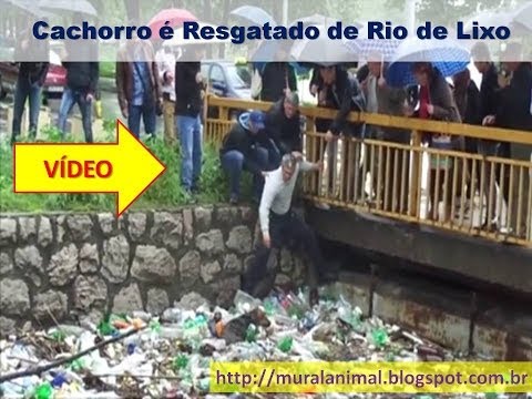 Cachorro é resgato por populares de dentro de rio tomado por lixo
